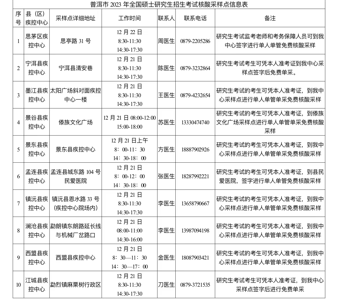 附:普洱市2023年全國碩士研究生招生考試核酸采樣點(diǎn)信息表