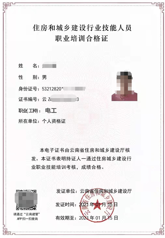 1、建筑電工證,由“云南住房和城鄉(xiāng)建設(shè)廳”頒發(fā),證書每2年進行一次“再教育繼續(xù)學習”,如果證書過期將需要重新考取!