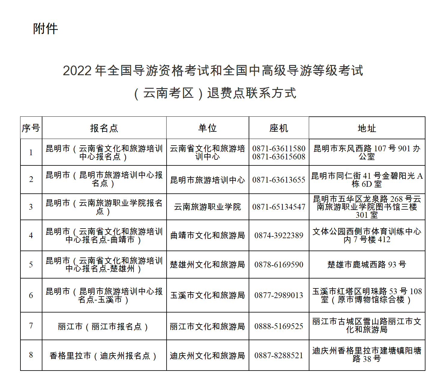 附件:2022年全國導(dǎo)游資格考試和全國中高級導(dǎo)游等級考試(云南考區(qū))退費點聯(lián)系方式
