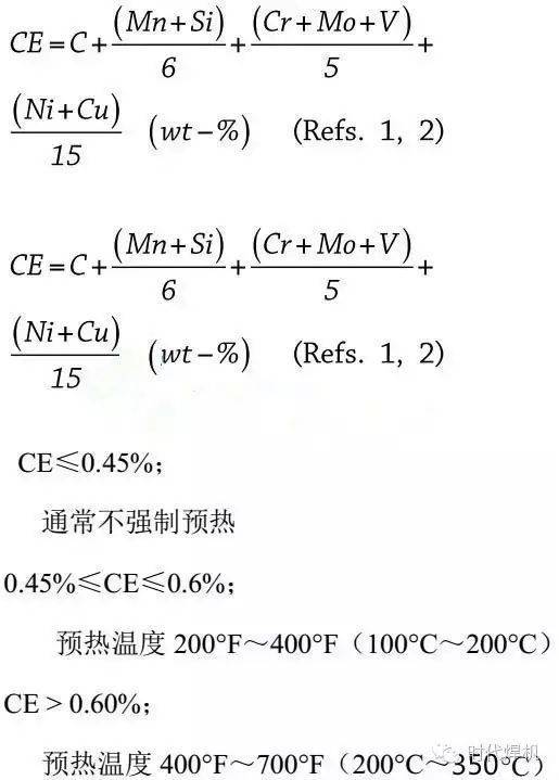 碳當量(CE)可以用作確定預(yù)熱的實際必要性和預(yù)熱等級的方法。碳當量計算公式如下: