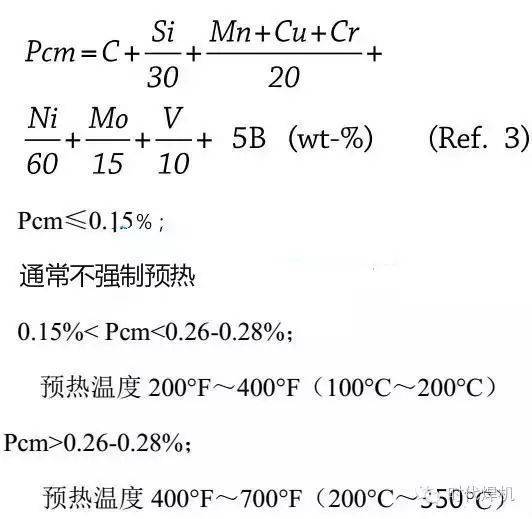 當碳含量≤0.17(重量百分比),或涉及到高強鋼時,可以使用Ito & Bessyo裂紋量度參數(shù) (Pcm)。對于何時需要預(yù)熱,何時要強制預(yù)熱,以及推薦什么預(yù)熱溫度,這種方法提供了更加準確的評估。公式如下: