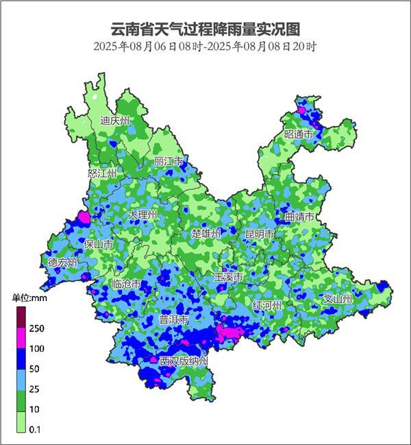 8月8日晚,中東部、南部、西部邊緣等地出現(xiàn)強降雨過程已結(jié)束,過程平均雨量26.1毫米,最大小時雨量94.6毫米,出現(xiàn)在昭通市鹽津縣廟壩鎮(zhèn)黃草站。