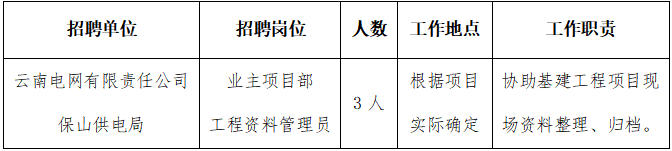 為支撐業(yè)務(wù)發(fā)展,解決臨時(shí)性、短期性人力資源緊缺問(wèn)題,依據(jù)國(guó)家法律法規(guī)及公司規(guī)章制度規(guī)定,結(jié)合保山供電局實(shí)際情況,現(xiàn)面向社會(huì)公開招聘短期項(xiàng)目制用工3人,具體事項(xiàng)公告如下: