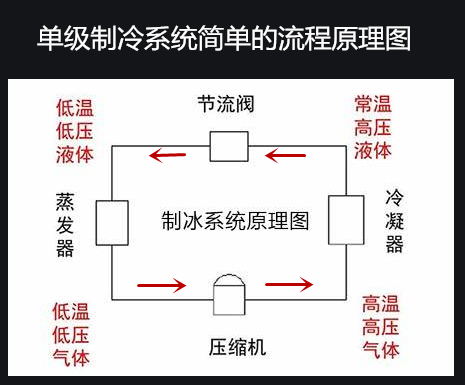 蒸汽壓縮式的冷庫(kù)制冷系統(tǒng)的流程原理,仍是大家熟悉的四大過(guò)程,即:壓縮——冷凝——節(jié)流——蒸發(fā)。相應(yīng)的配套的主要設(shè)備是制冷壓縮機(jī),冷凝器(風(fēng)冷式或水冷式),節(jié)流閥(氟制冷系統(tǒng)為熱力膨脹閥),蒸發(fā)器(冷庫(kù)常用的為直冷排管和風(fēng)冷式風(fēng)機(jī))。